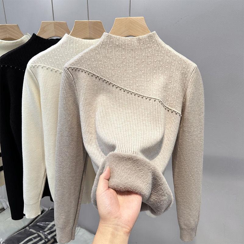 Autumn and Winter Loose and Thick Woolen Sweater for Women with Integrated Warmth and Velvet Lining Semi High Neck Solid Color Knitted Base Sweater S biały